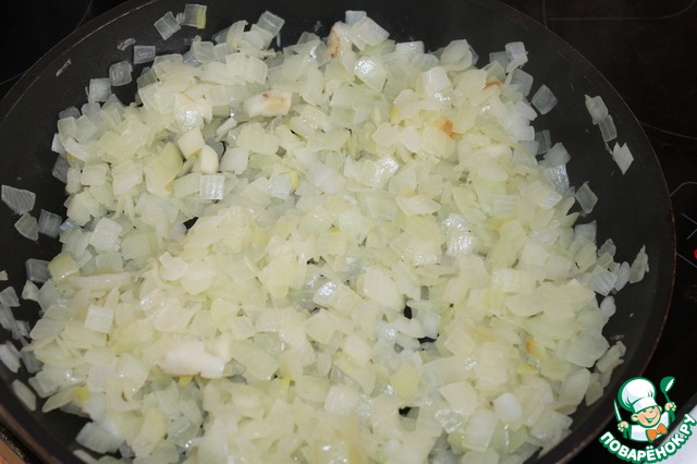 Лук обжарить до прозрачности, не стоит его сильно румянить. Остудить.