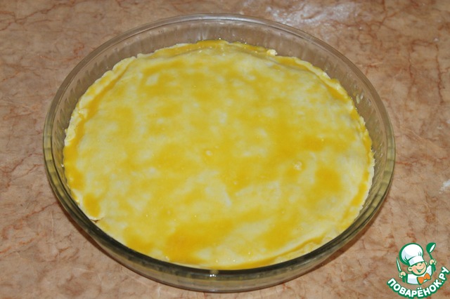 Раскатать оставшуюся часть теста и выложить сверху, защепить края. Смазать пирог желтком. Испечь в духовке до готовности около 30 минут при 180 градусах до румяной корочки.