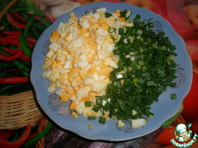 Сварите яйца вкрутую, порежьте небольшим кубиком тоже, нарежьте зеленый лук.