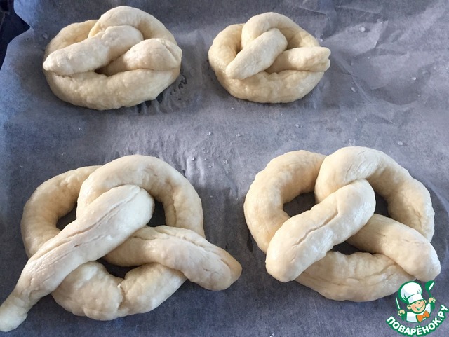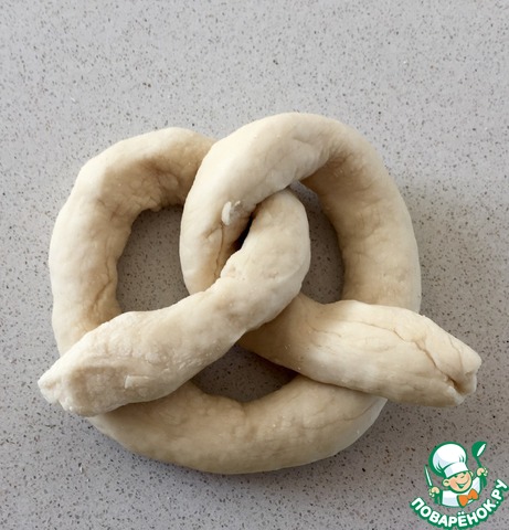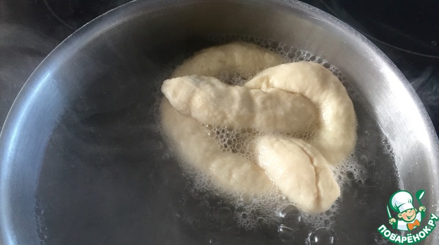Все сформированные крендельки оставьте на 10 минут под полотенцем. Наберите воду в кастрюлю. Добавьте соду. Как только вода закипит, опустите каждый бретзель на 30 секунд и выложите на бумагу для запекания.