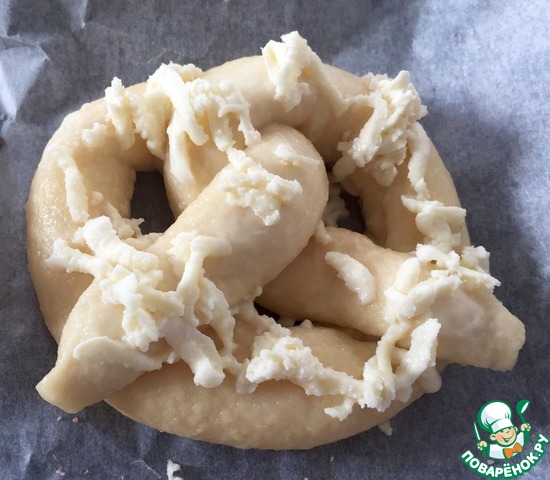 Закрыть и по той же схеме сформировать крендель! посыпать сверху сыром. Но это чуть позже. А сначала...