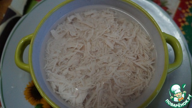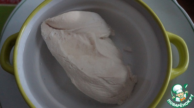 Возьмем куриную грудку и отварим ее. Затем нужно замочить ее в холодной воде на полчаса.