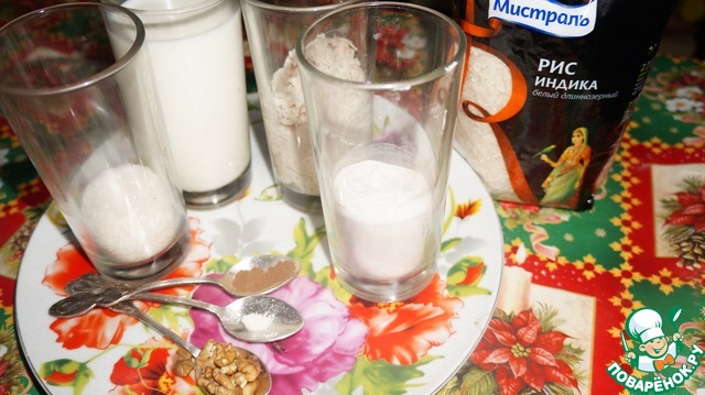 Теперь нам понадобятся: рисовая мука, сахарный песок, вымоченная куриная грудка, ванилин и корица.