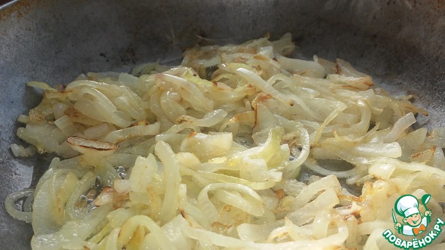 Лук порезать полукольцами и обжарить. Я жарила на взятом из бульона бараньем жире, можно это сделать на сливочном масле. Добавить к луку вареные ребрышки и обжарить их. Я ребрышки не жарила, а сразу положила в готовую полбу, но жареные будут вкуснее.