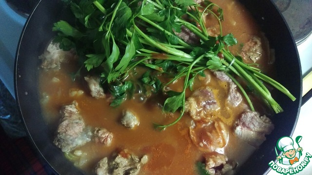 Влить воду, положить томатное пюре, связанную в пучок зелень, порошок корицы, размешать и тушить на слабом огне до готовности мяса.