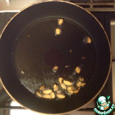 Пока креветки "маринуются" разогреть на сковороде растительное масло, положить в него нарезанный дольками чеснок. Поскольку масло нагрето как следует, сразу после этого огонь можно выключить, чесночек итак зажарится. После этого чеснок из масла вынимаем, сковороду возвращаем на огонь, в неё кладём креветки.