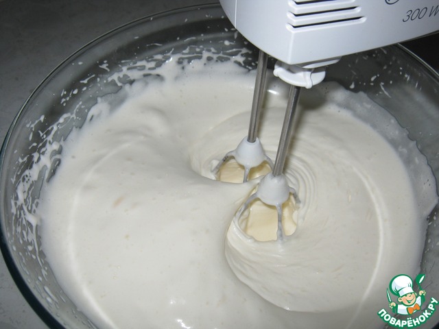 Для двух тортов понадобятся два бисквита круглой формы (d=19см) и один прямоугольный размером с противень (40х33см). Включить духовку на 180 С. Для каждого круглого бисквита приготовить тесто: 4 яйца и 115 г сахара взбить в густую массу.