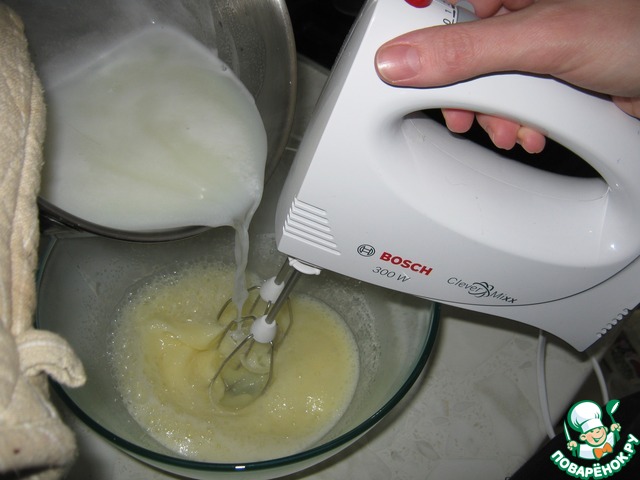 Пока пекутся бисквиты, приготовить крем: в молоко всыпать больше половины сахара (измерять не обязательно), помешивая, довести до кипения и проварить 3 мин. В это время оставшийся сахар смешать с яйцами и, не переставая быстро размешивать, вливать тонкой струйкой молочно-сахарный сироп.