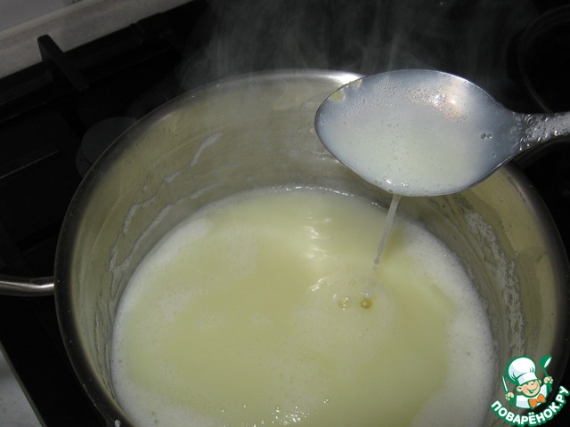 Перелить массу обратно в кастрюлю, варить (помешивая) 5 мин до консистенции жидкой сгущенки. Охладить.