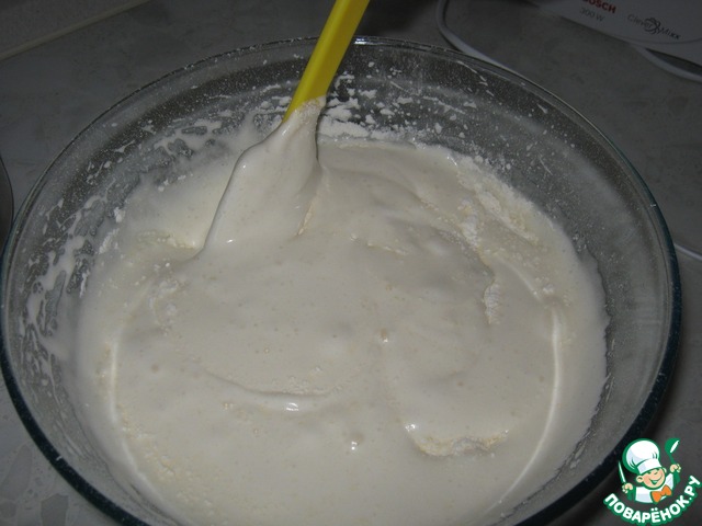 120 г муки просеять сверху, и аккуратно лопаткой сверху-вниз вмешать ее.