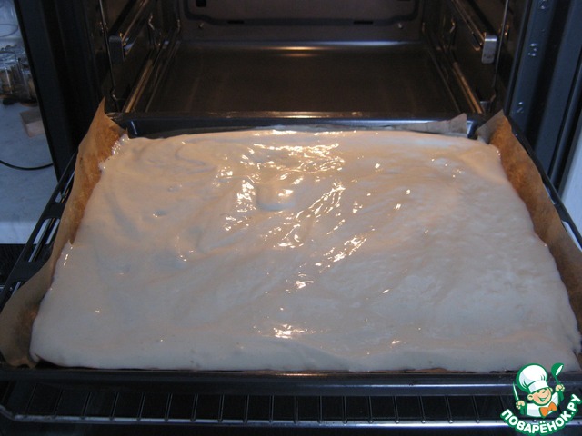 Приготовить тесто для прямоугольного бисквита, выложить на противень с пергаментом, испечь.