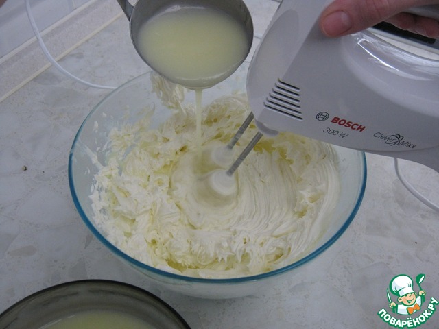 Холодное масло взбить до белой пышной массы, не прекращая взбивать, понемногу вливать приготовленный сироп. Готовый крем глянцевый, хорошо держит форму.