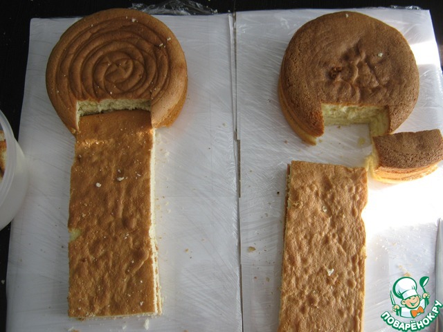 Каждый круглый бисквит разрезать на 3 пласта, а прямоугольный- на 4 по ширине.
