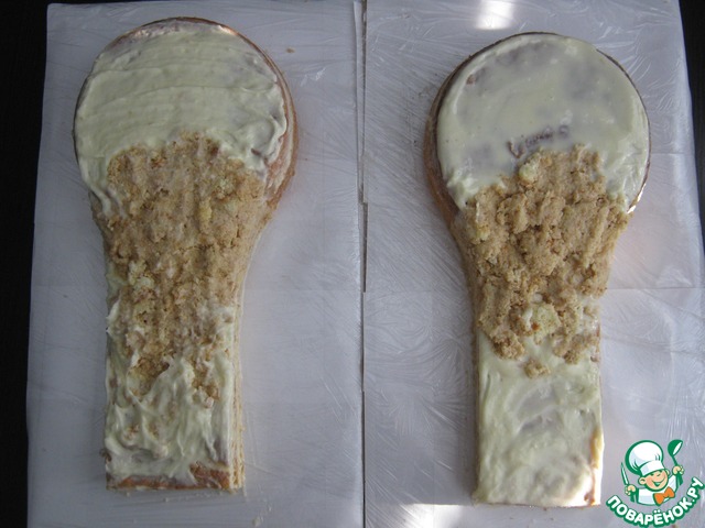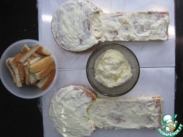 Коржи промочить (слегка) сиропом (воду с сахаром прокипятить 2 мин, ОХЛАДИТЬ, добавить коньяк), промазать кремом (отложить 4 ст. л. для "шпаклевки"), собрать заготовки.