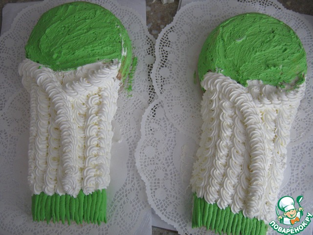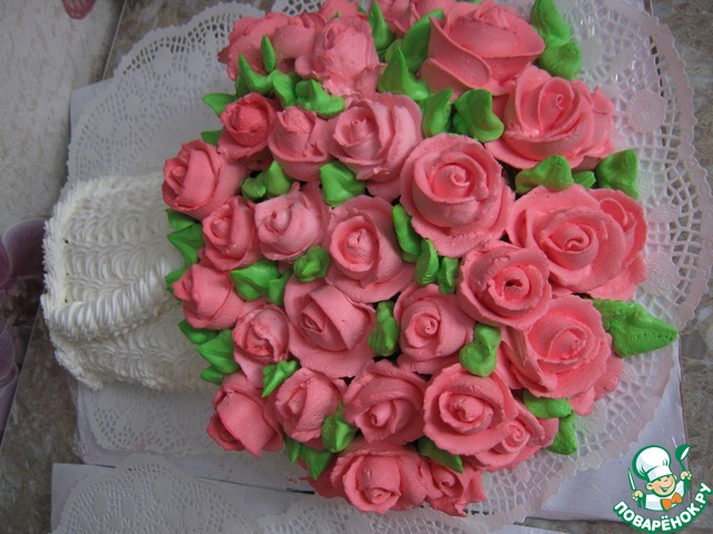 Насадкой "звездочка" оформить "упаковку" букета. Небольшую часть взбитых сливок подкрасить в зеленый цвет, прорисовать корнетиком стебли роз. Корнетик: свернуть кусок пергамента кулечком, отрезать узкую часть, чтобы получилось отверстие диаметром 5 мм. Обмазать зелеными сливками части тортов, где будут бутоны.