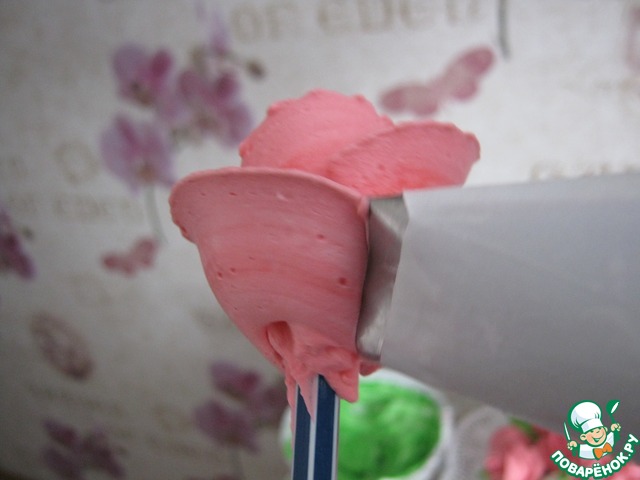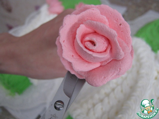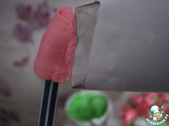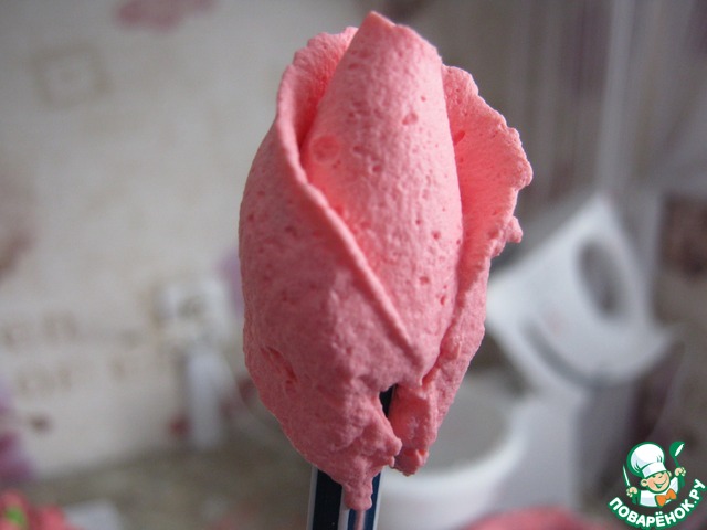Взбить еще часть сливок, подкрасить в розовый цвет, накрутить розы: обвести вокруг карандаша насадкой "роза" (отверстие в виде узкого овала),