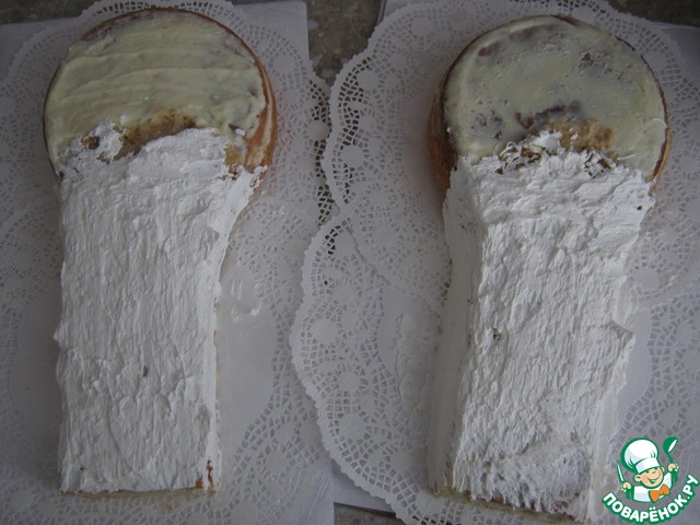 Взбить сливки (не все сразу), нижние части тортов обмазать ими, подложить ажурные салфетки.