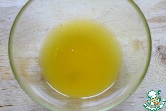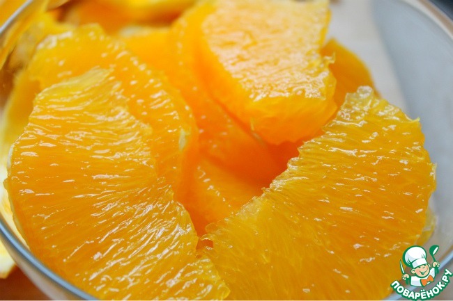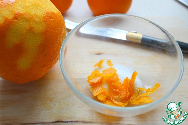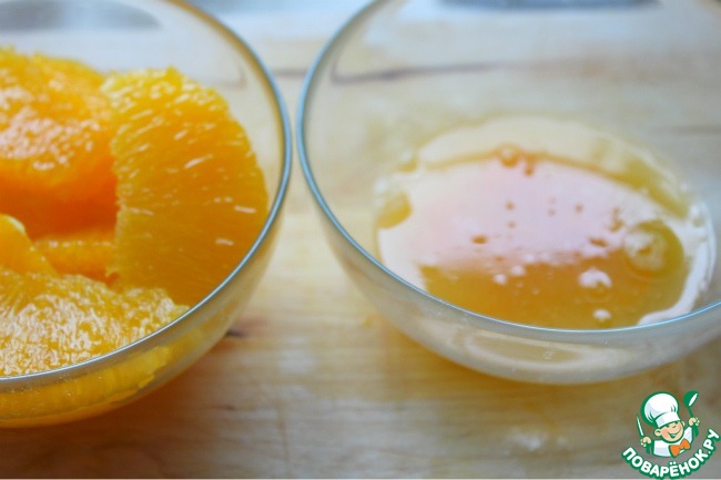 Залить филейки 200 мл Просекко и поставить в холодильник. В емкость с сахаром выжать апельсиновый сок из того, что осталось после филирования и поставить в холодильник.