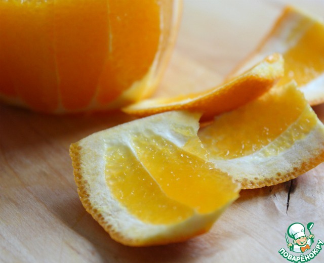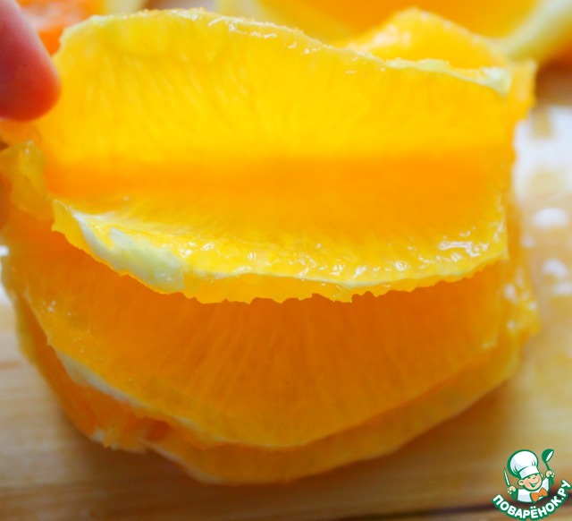 Срезать у апельсина верхушку и низ и снять с боков ножом кожуру до мякоти - филеруем апельсин