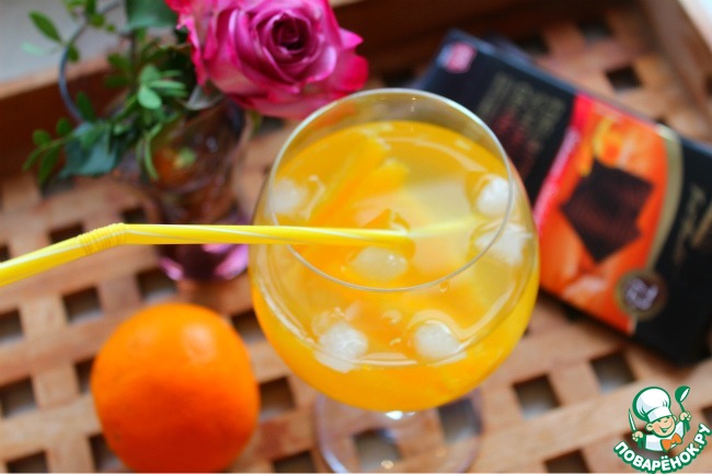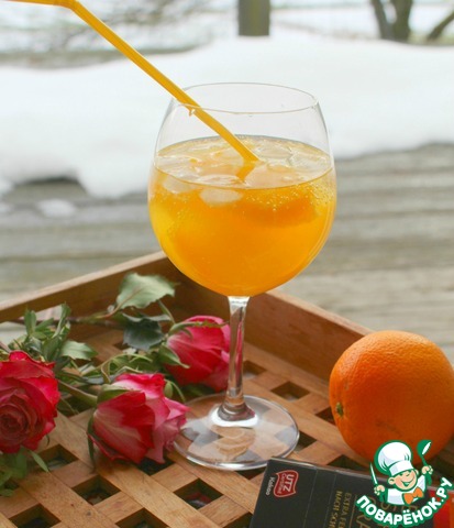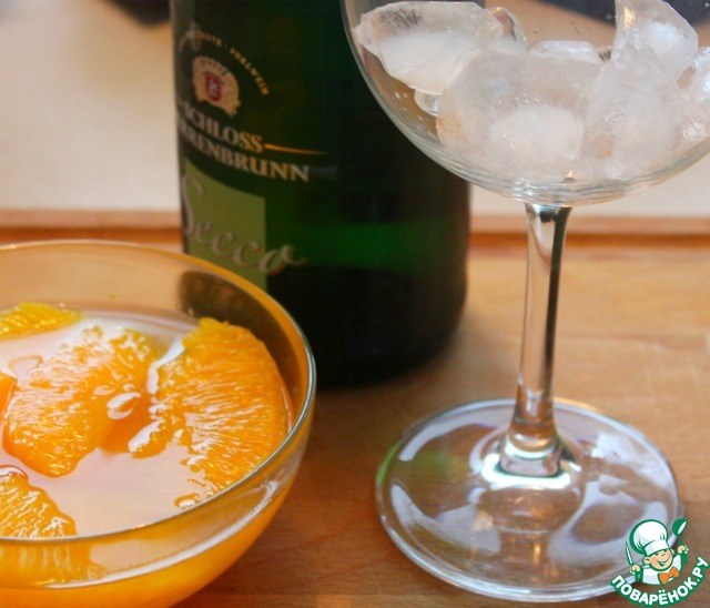 В бокалы кладем лед кусочки апельсинов вместе с жидкостью, вливаем сок из под цедры, доливаем холодное вино и