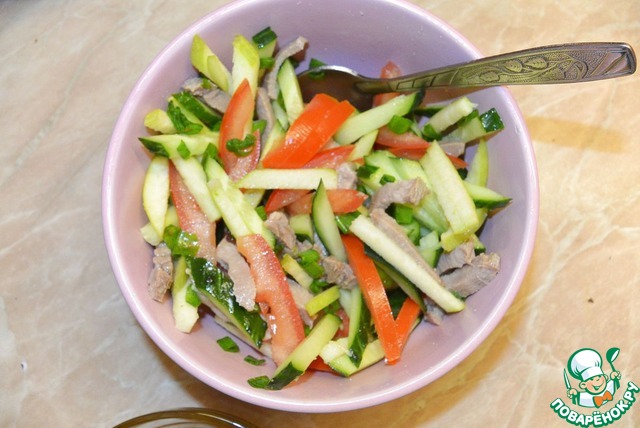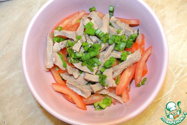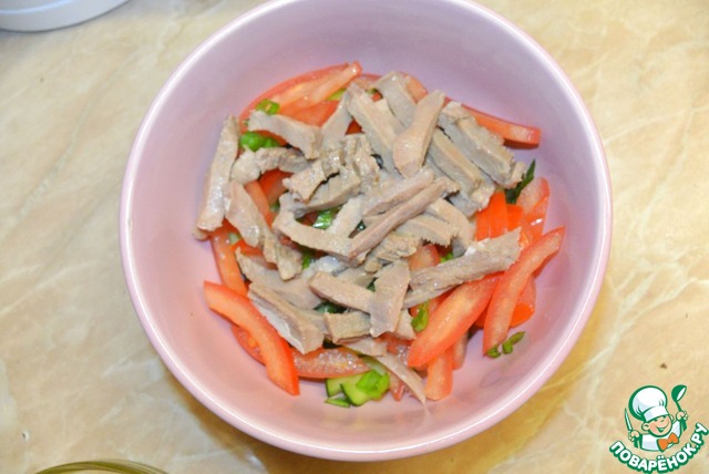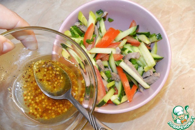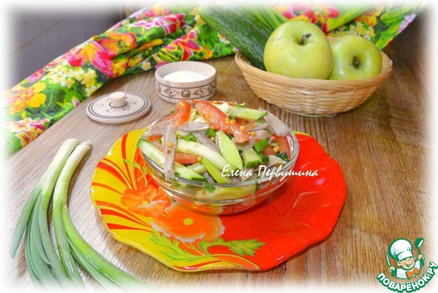 | Предлагаю попробовать этот удивительный салатик из свежих овощей и отварного языка, заправленный пикантной заправкой на основе меда, зерновой горчицы и соевого соуса - очень вкусно, освежающе и пикантно! |