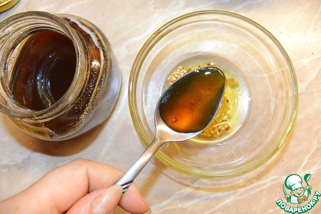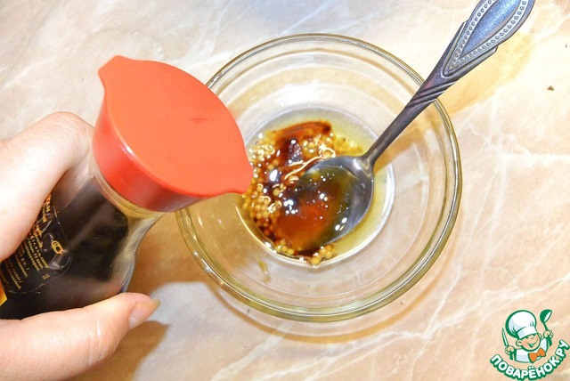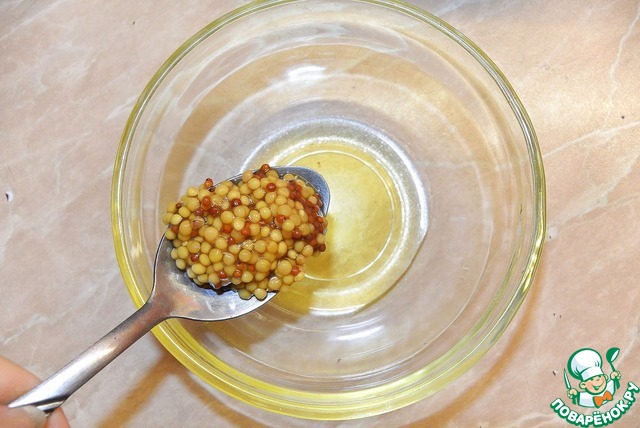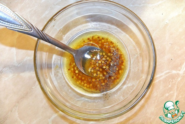 Сделать заправку: в оливковое масло добавить зерновую горчицу,