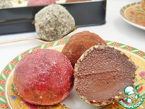Из застывшей массы сформовать круглые конфеты, работать необходимо в прохладном помещении, в перчатках. Обвалять трюфели в обсыпке, убрать в морозильную камеру и хранить там до подачи.