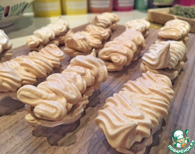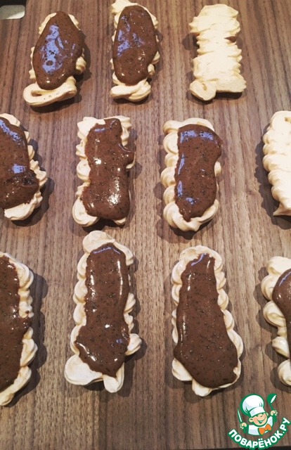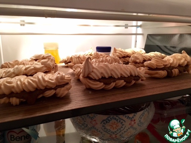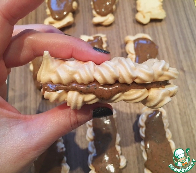 Нужно аккуратно намазать кофейно-шоколадную массу на одну часть безе и прикрыть второй половинкой.