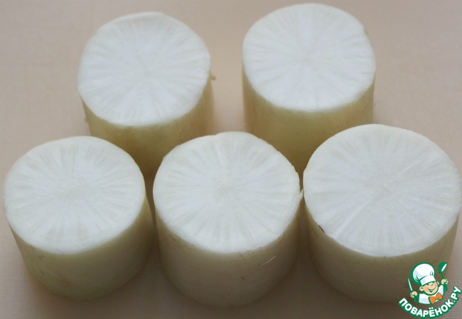 Я сначала нарезала, а потом очистила - дайкон был очень сочный.