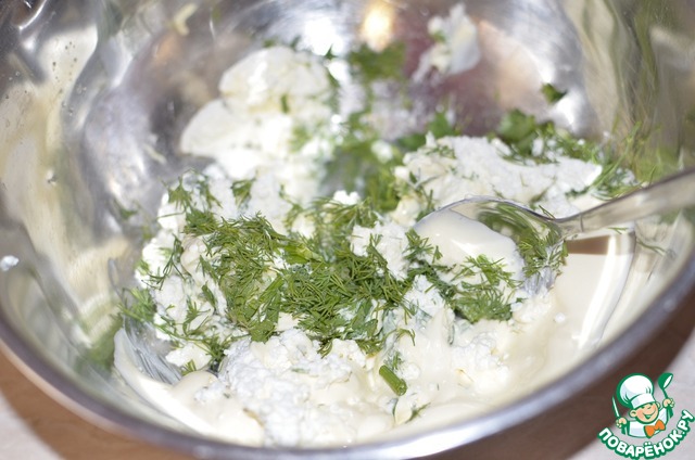 Йогурт для начинки нужен густой, чтоб йогурт стал гуще, необходимо его подвесить в марлю и специальное мелкое сито, чтоб стекла лишняя сыворотка, примерно на 1 или 2 часа. Творог, йогурт, выдавленный через пресс чеснок и зелень соединить в миске, посолить по вкусу.