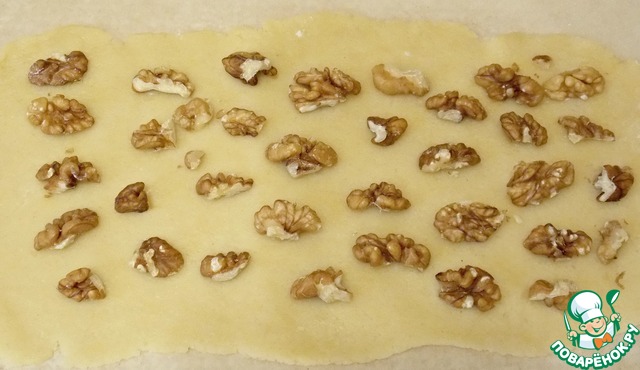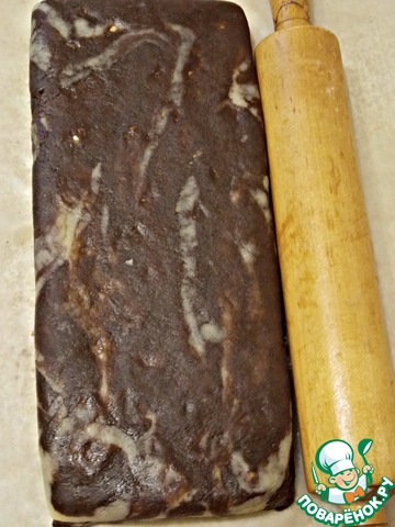 Затем разделить каждый шар на четыре части. Раскатать сначала одну светлую часть в прямоугольник на припылённом мукой столе. Перенести на пекарскую бумагу, большУю по размеру. Уложить кусочки ореха на расстоянии. Раскатать одну темную часть и при помощи скалки накрыть светлый прямоугольник. Положить на него орехи в промежуток между первыми. Не переживайте, Вы их почувствуете, когда будете класть.