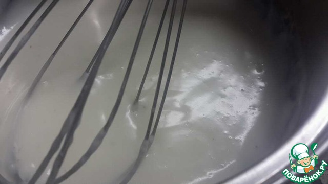 В это время, смешать крахмал и отделённое молоко, до однородности. Влить в закипающее содержимое кастрюли, энергично помешивая.