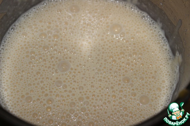 Творог, персиковый сок, сахар взбиваем блендером до полного растворения (минут 5). Желатиновую смесь нагреваем, помешивая, но не кипятим! Остужаем. В творожную смесь тонкой струйкой вливаем желатин, взбивая миксером.