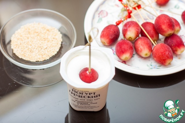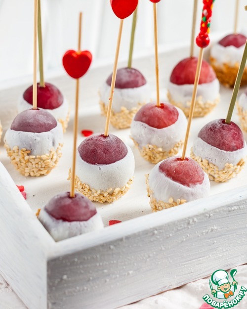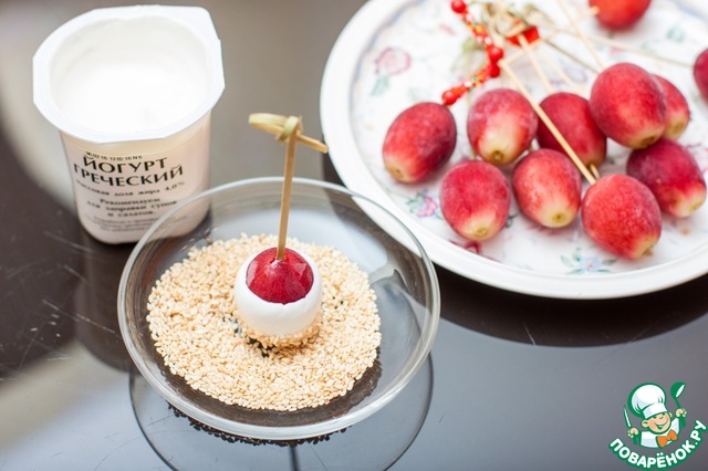 Виноградинки на шпажках окунаем в густой йогурт, он на замороженных ягодках мгновенно подмерзает и очень хорошо держится.