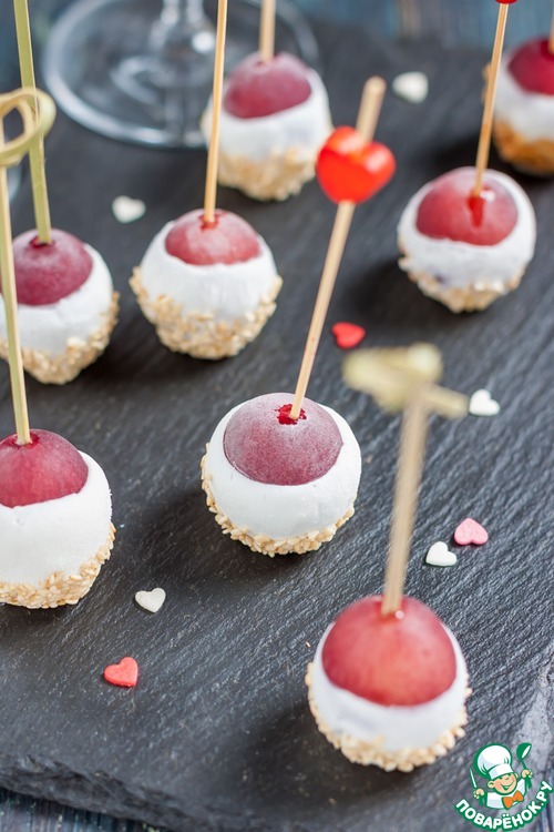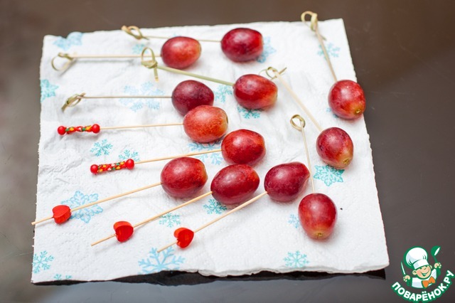 Отделяем виноградинки, протираем от налета и обсушиваем салфеткой. Нанизываем на зубочистки или шпажки. Отправляем в морозилку минимум на час, можно на ночь.