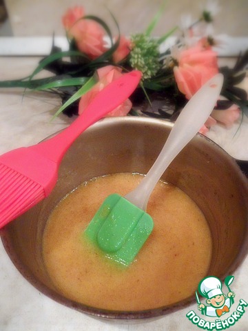 Готовим глянцевое покрытие- хурму пюрировать блендером, добавить желатин, сахар, сок лимона. Прогреть на водяной бане до полного растворения желатина. При помощи кулинарной кисти нанести покрытие на наше суфле. Поставить на 30 минут в холодильник.