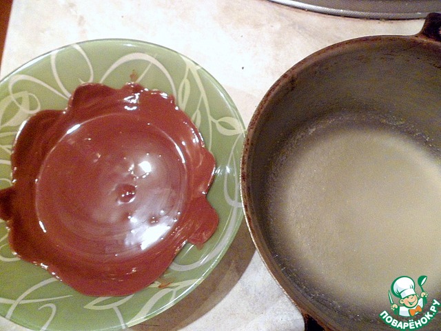 В это время готовим шоколадную глазурь. Желатин замочить в сыворотке на 10 минут. Шоколад растворить на водяной бане и соединить с желатином, перемешать, если желатин не совсем растворился, подогреть массу на водяной бане.