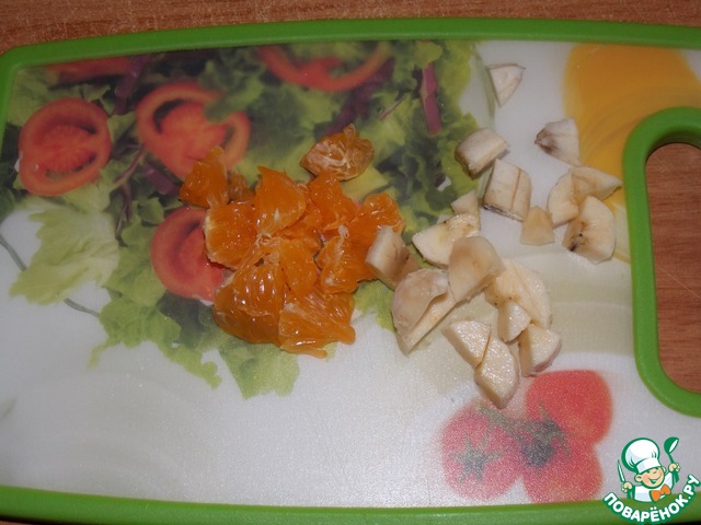 Банан и мандарин очистить, порезать небольшими кубиками.
