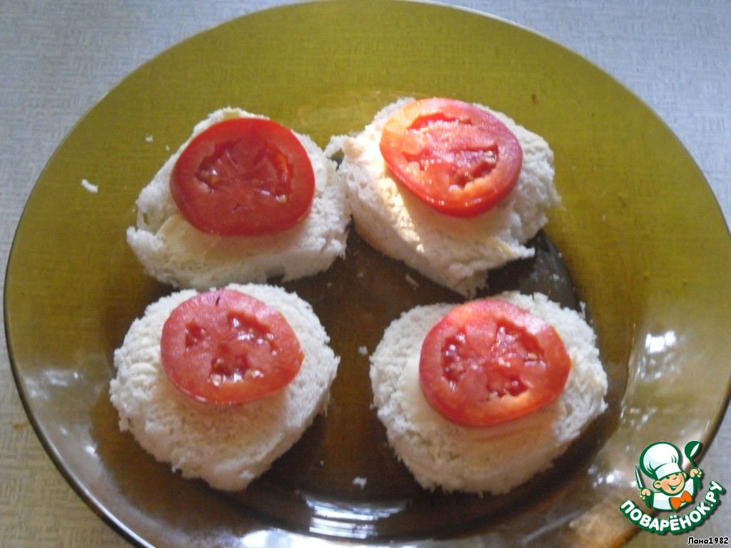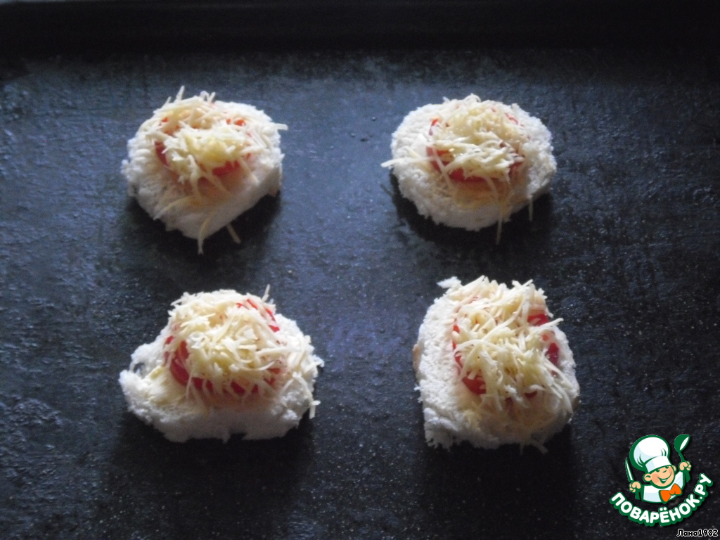 Духовку разогреть до 180*С. Хлеб нарезать ломтиками и срезать корки, так чтобы ломтики были чуть больше кружочков помидоров.