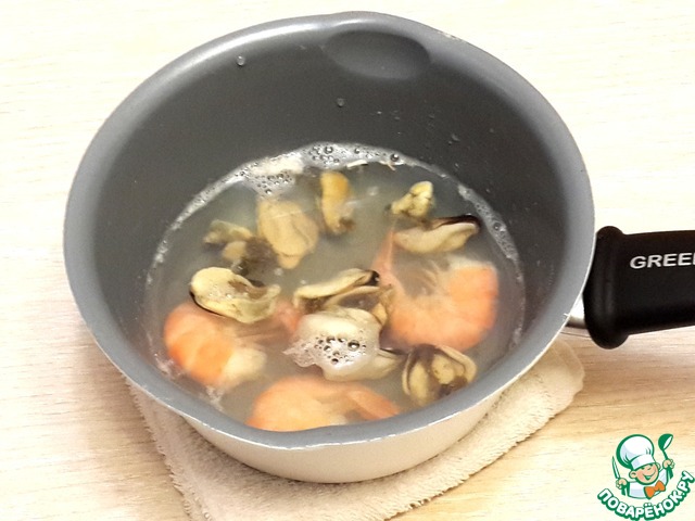 Креветки и мидии залейте водой, добавьте соль и варите 1 минуту, слейте воду и остудите.