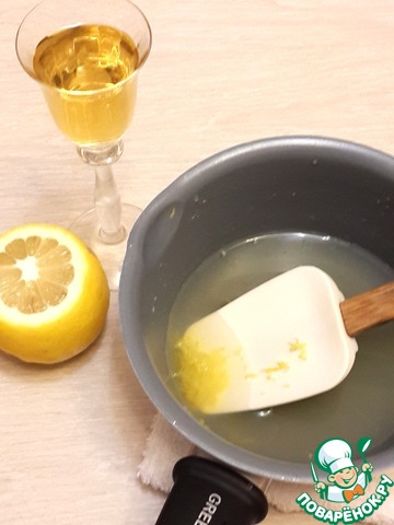 В остывший бульон от морепродуктов добавьте сок и цедру половины лимона, влейте вино, добавьте желатин и оставьте на 1 час.
