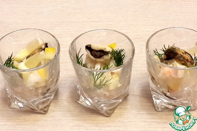 Разложите по рюмкам мидии, креветки и лимон, добавьте по веточке укропа.