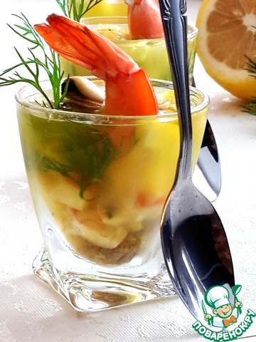Бульон с желатином и вином нагрейте до растворения желатина и залейте им морепродукты. Вставьте хвостики креветок и поместите в холодильник до полного остывания желе.