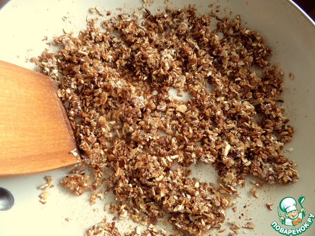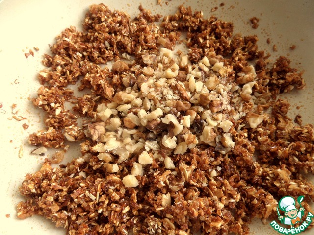 Добавим в сковороду горсть дроблёных грецких орехов (можно семечек). Греем всё вместе на огне, помешивая. Выключаем.