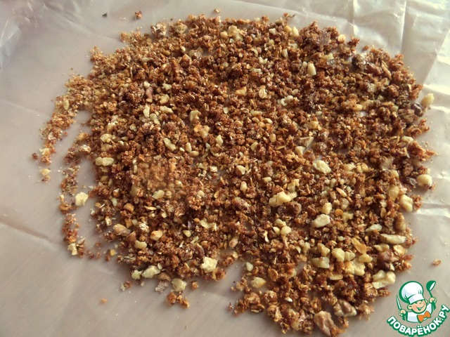 Рассыпаем грильяж ровным слоем на плёнке (у меня пакет от хлопьев-сухих завтраков). Если есть крупные комочки, давим их толкушкой или скалкой.