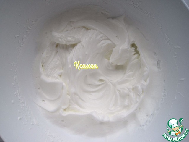 Сливки смешаем с 2-мя столовыми ложками сахарной пудры и взобьём миксером в пышную устойчивую пену.