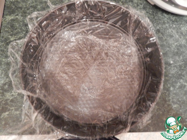 Разьёмную форму выстилаем пищевой плёнкой (У меня форма на 28) так чтобы хорошо свисали края