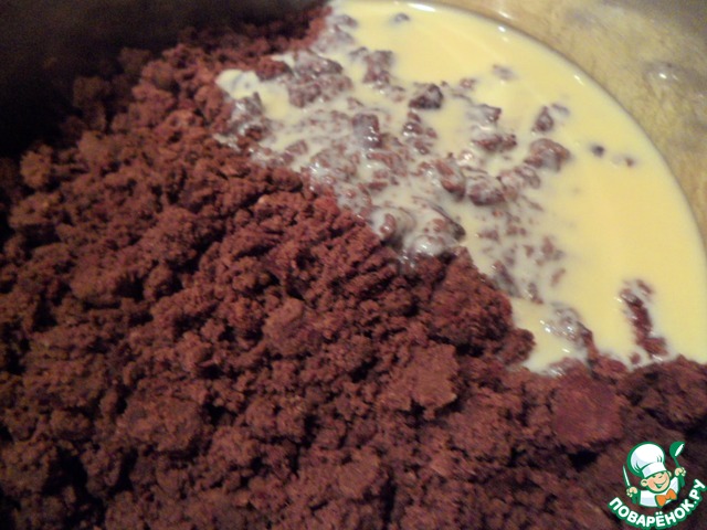Измельчить в крошку бисквит, добавляем сгущенное молоко понемногу - главное не переложить, смотреть по консистенции, перемешиваем в однородную массу.