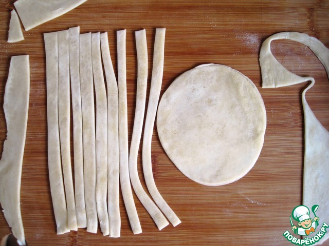 Тесто раскатываем максимально тонко (примерно 2 мм), вырезаем кружок такого размера, которым можно будет выстелить дно и стенки формочки, при этом края теста должны свисать с формочки. Остаток раскатанного теста подравниваем ножом, что бы получился прямоугольник и нарезаем на тонкие полоски.
