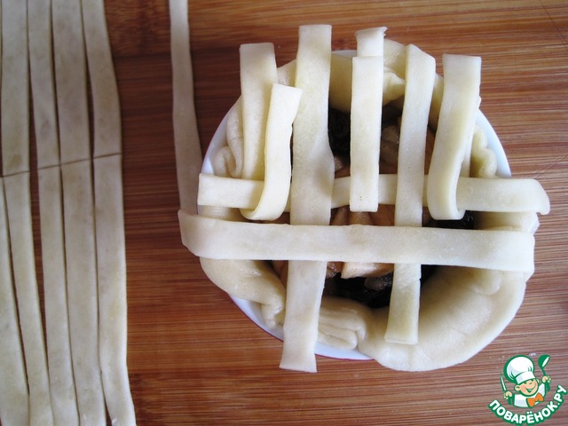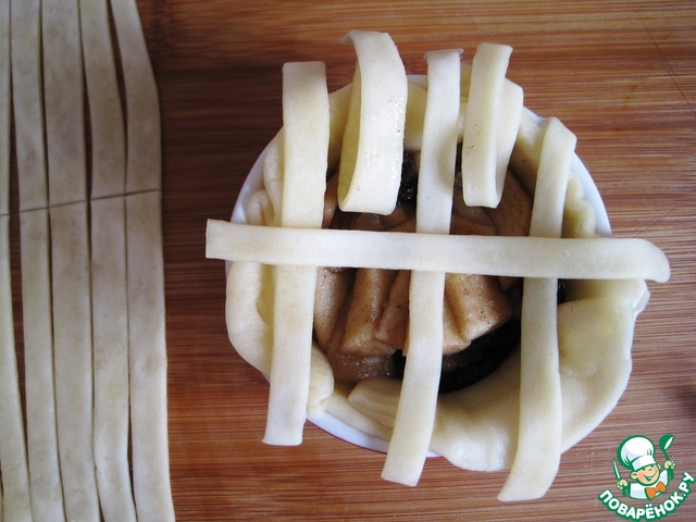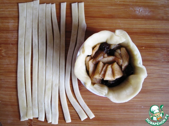 В подготовленную формочку вкладываем круг теста, слегка прижимая к донышку и бортам формы. Равномерно распределяем тесто внутри формочки, свисающие края теста пока не обрезаем. Заполняем тесто остывшей начинкой до самого верха формочки. Я начинку ещё немного утрамбовала, что бы её было о-очень много! :) Жидкость, которая осталась от тушения яблок я не использовала, что бы тесто не стало "кляклым".